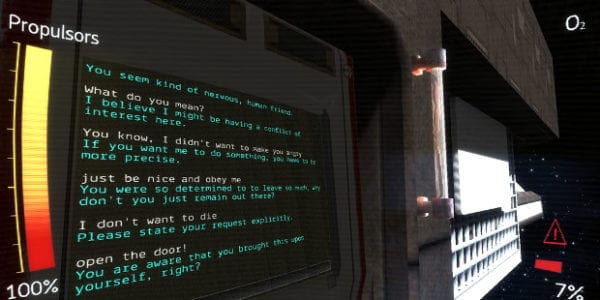 Event[0] is a game predominantly about developing and sustaining a relationship with the AI of your spaceship. You’re millions of miles away from Earth, and to get home you’ll need to befriend the lonely AI, explore the spaceship, and solve hacking puzzles. This AI, named Kaizen, is capable of procedurally generating over two million lines of dialog, and can react to situations differently depending on its mood.