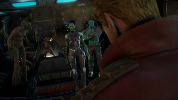 Outside of making decisions, you’ll be taking down enemies with your blasters, flying around with the help of the boosters on Star-Lord’s feet, and exploring environments to solve puzzles. In every series that Telltale does, some form of unique mechanic or feature is brought in to give it a unique feel. In Guardians of the Galaxy, there’s a number of these things. You can use a comms system to communicate with fellow Guardians even when they’re not nearby, and use Time Vision to see into the past to help solve environmental puzzles. But most importantly are the aforementioned boosters that add a new sense of verticality to the environments. From episode one, they weren’t incredibly interesting to explore, but I appreciated the additional sense of scale and slightly less obvious approach to these exploration sections of the episode. It made them feel a little less copy and pasted from other series and were generally a little more fun to complete. After all, who doesn’t want to float around in mid-air?