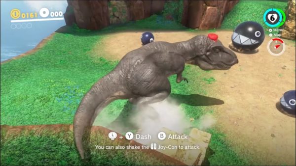 If you had told anyone years ago that the next Mario game would allow Mario to become a photo-realistic Tyrannosaurus Rex, nobody would have believed you. Yet, here we are. As early as the Cascade Kingdom, Mario encounters a T-Rex and, as you do in Mario Odyssey, you throw your hat at it and take it for a ride.