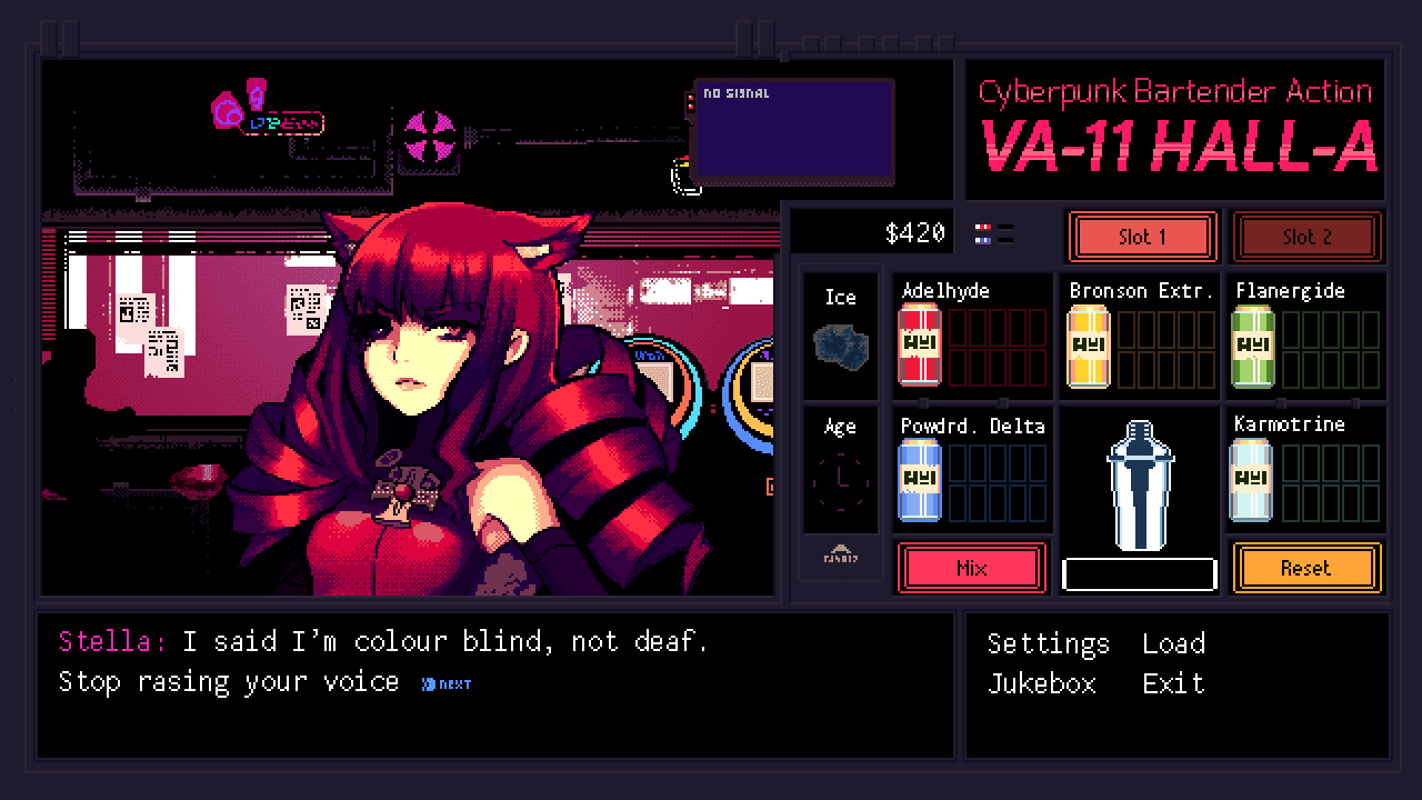 You know the one place that consistently looks incredible in futuristic fiction? That’s right: bars. Whether it’s Blade Runner or Mass Effect, futuristic pubs and clubs are a tidy summation of the genre’s tropes and sensibilities. VA-11 HALL-A, from start to finish, takes place in a solitary future bar in Glitch City, never leaving the confines of its neon-glazed watering hole. Players assume the role of a bartender as they talk to a variety of different people, solving what is essentially a puzzle to work out which type of drink will push the narrative forward.