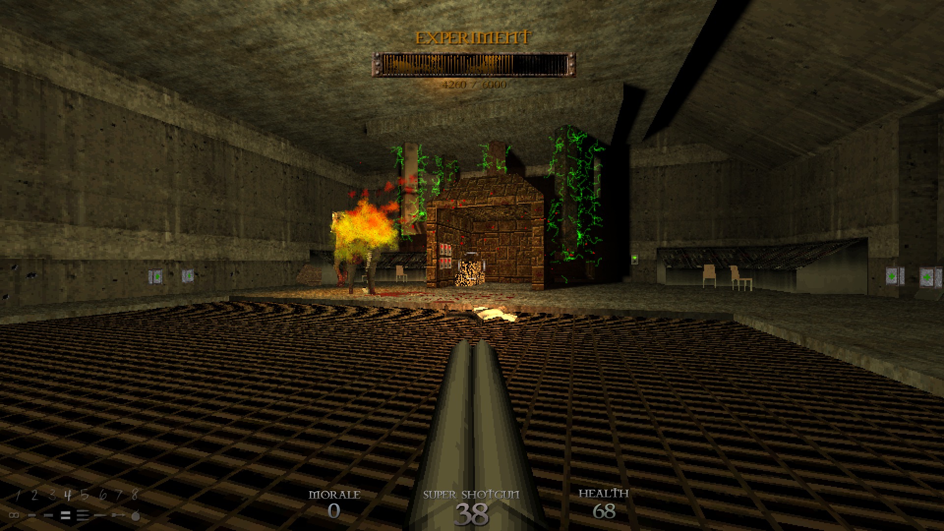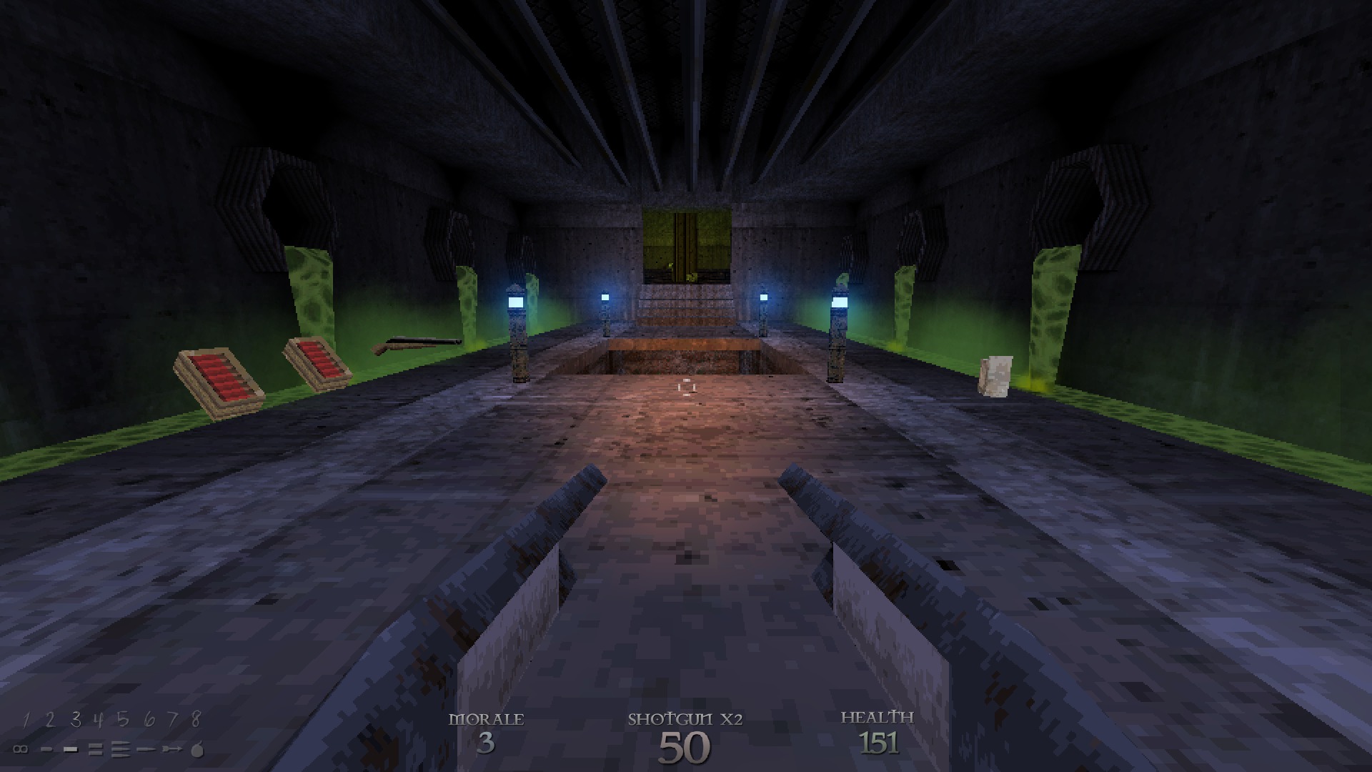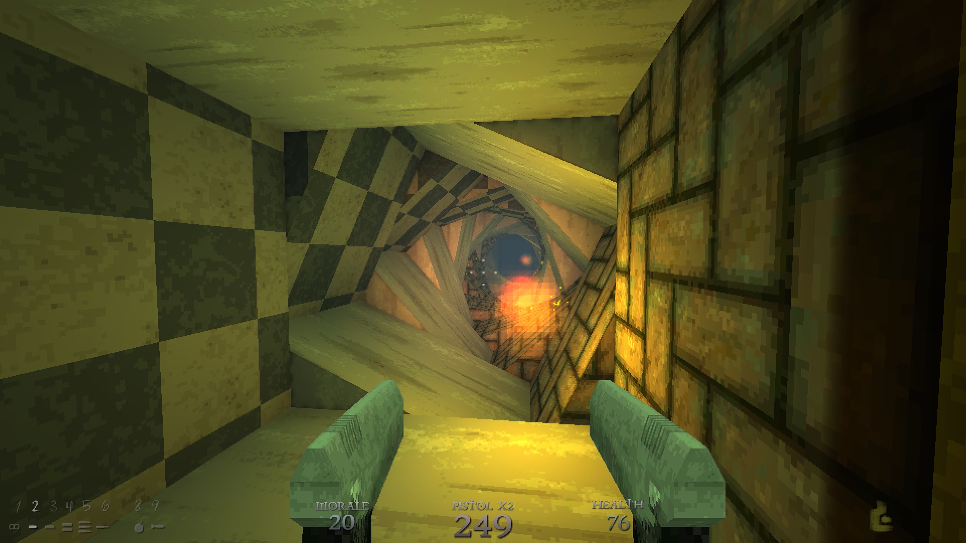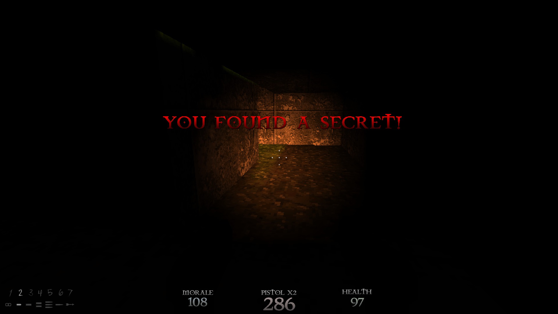 Like all 90s FPS games, DUSK doesn’t have regenerating health. Shocking, I know, so players who want to survive need to seek out med kits and armor. Well, the armor stand-in known as morale, represented by gold and diamonds. Sometimes, DUSK hands out surplus med kits and morale; other times it forces you to ration them, but regardless of how much the game doles out, you will only have as much as you deserve, depending on your skill. Oh, and before I forget, DUSK features a 100 health point limit that can be broken with magic potions and the Hallowed Health power-up. Given the enemies in the game, you’ll need every last one.