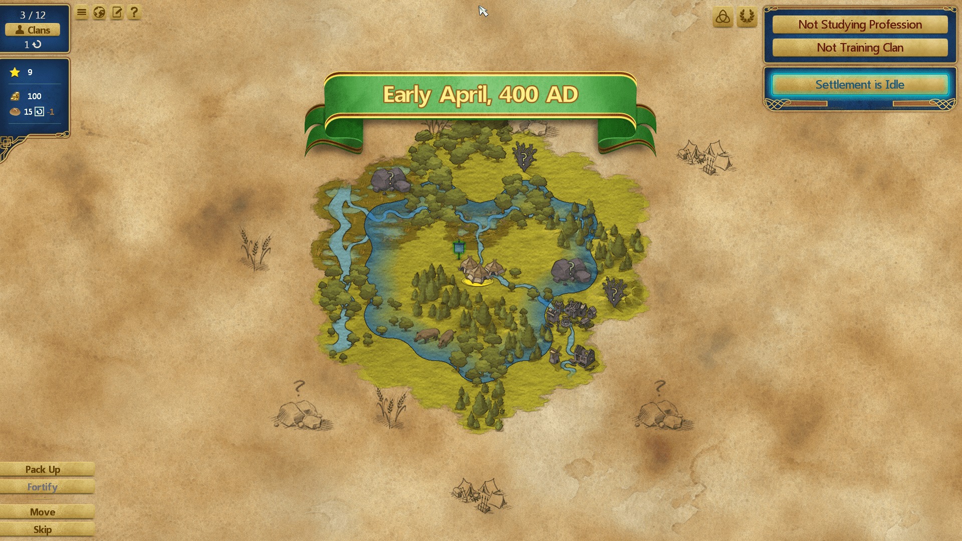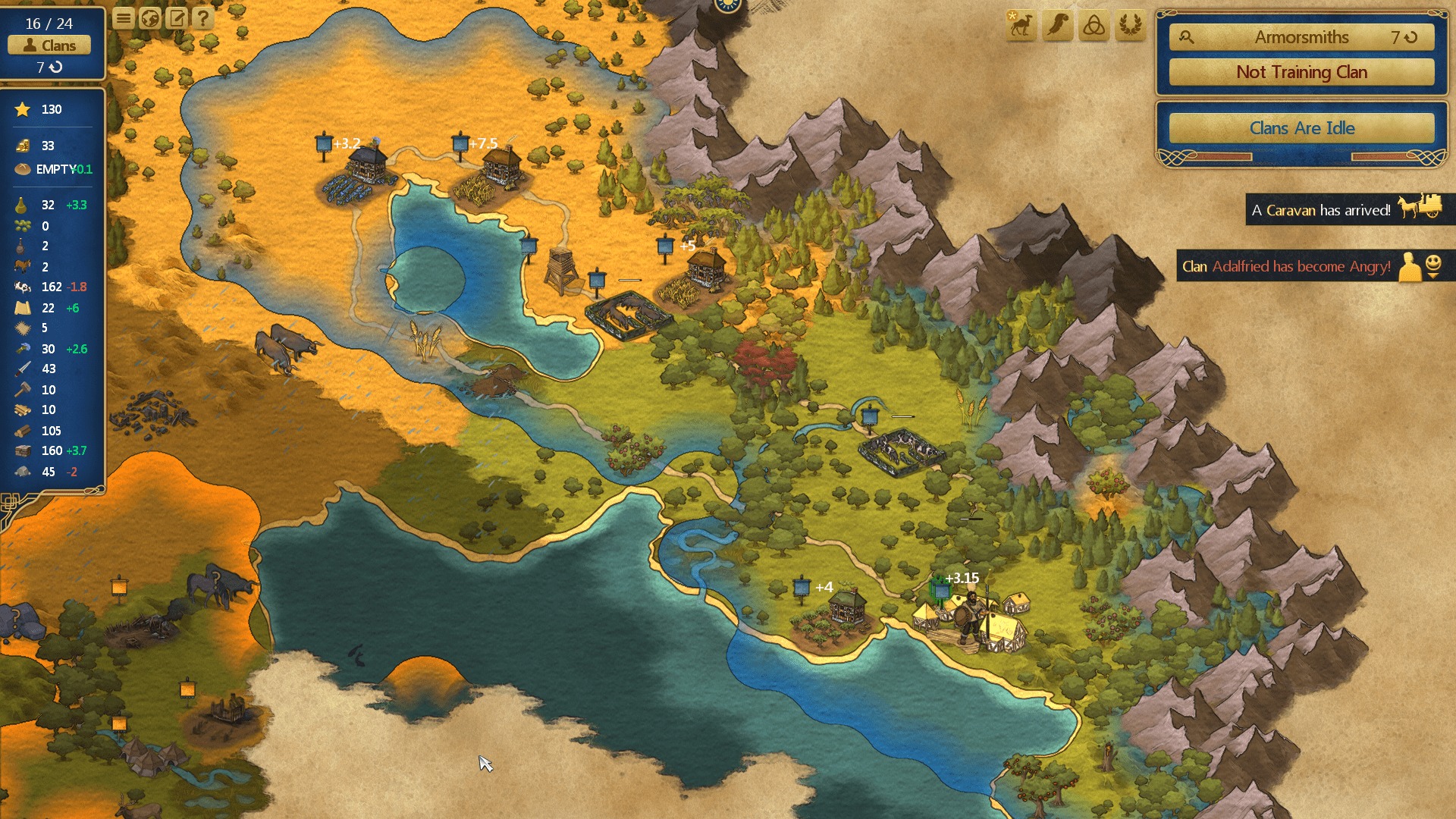 Each turn, your clans consume food, so finding a steady supply of it will be your first priority. This is done initially through specializing some of your clans to be gatherers or reapers, who can pick berries or harvest wheat or barley respectively.