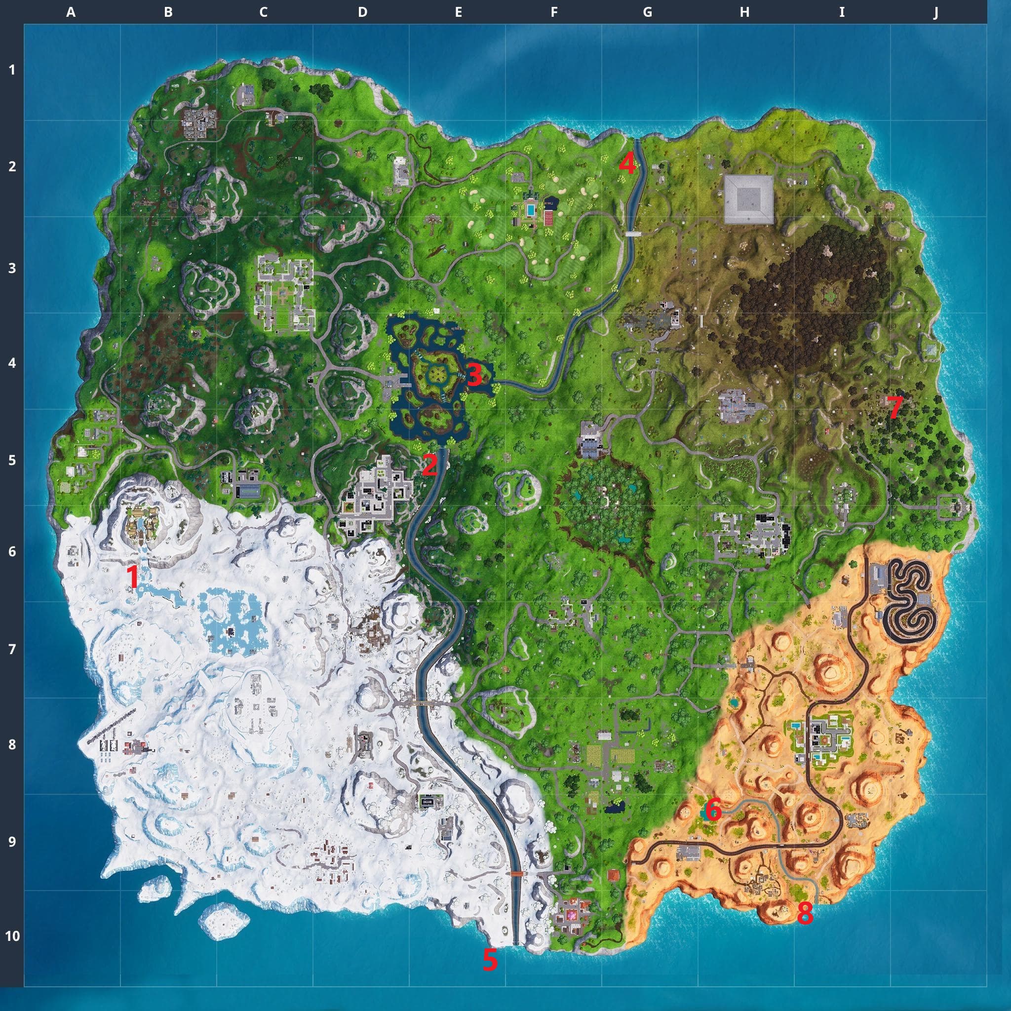 - South of Loot Lake, leading to the river running down the center of the map, you’ll find another of the waterfall locations in Fortnite. (E5)