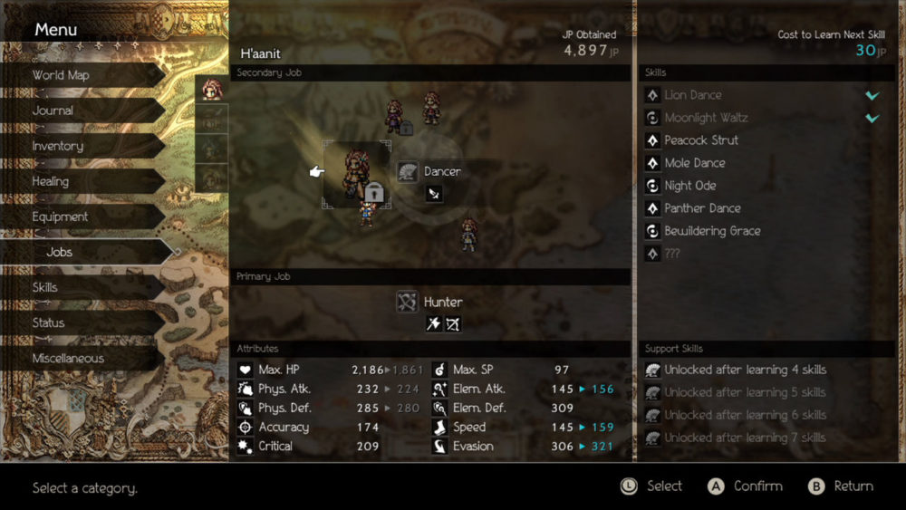 Unlike Final Fantasy XII, Octopath Traveler was built from the ground up with the dual job system in mind. Each character has a base class that they’re stuck with permanently, but later on you get access to all eight jobs that you can assign to any character you wish. So then, I’d be able to turn Cyrus into a black magic-wielding Scholar with buffing abilities by classing him as a Dancer.