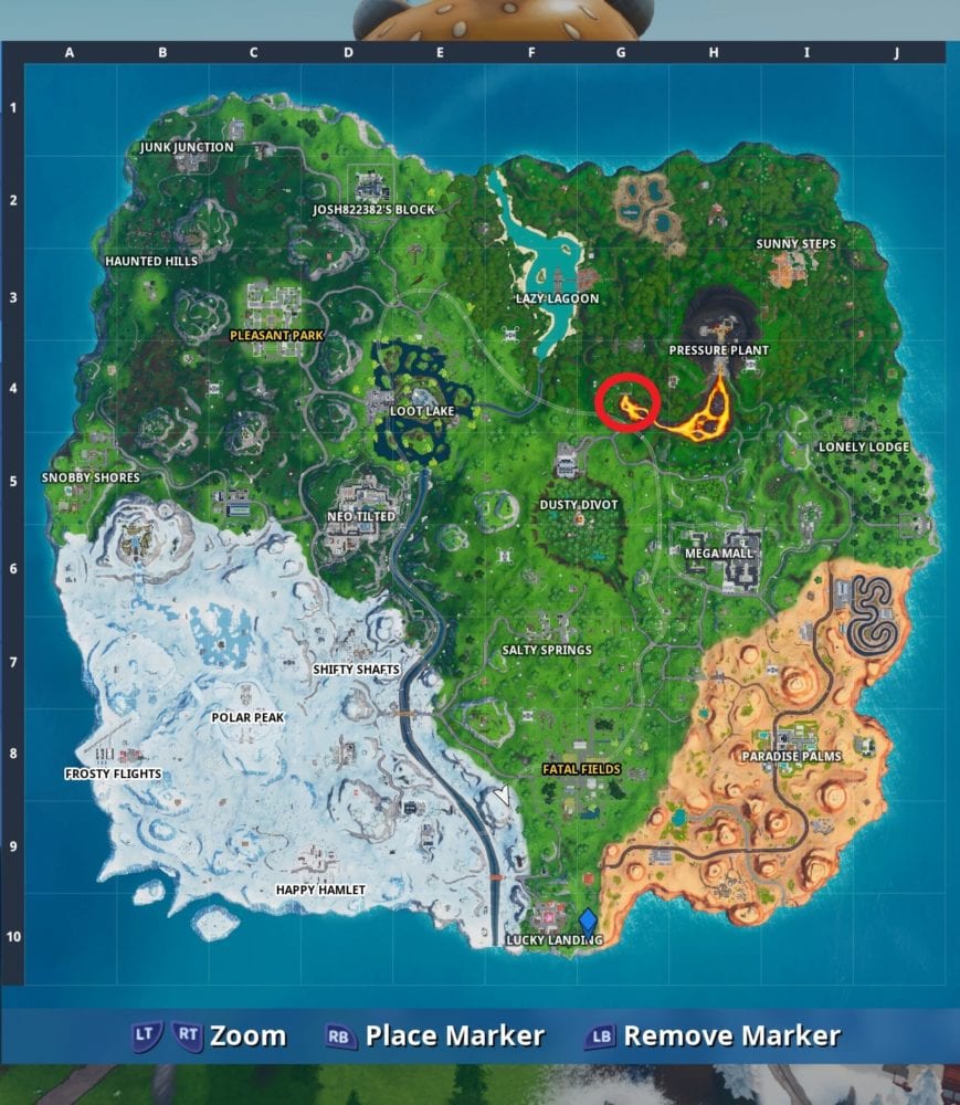 To get Fortbyte 12, you’ll need to head to the Molten Tunnel which can be found just southwest of Pressure Plant and the former volcano. You can check out exactly where you need to head in the screenshot down below. It’s that big red circle.