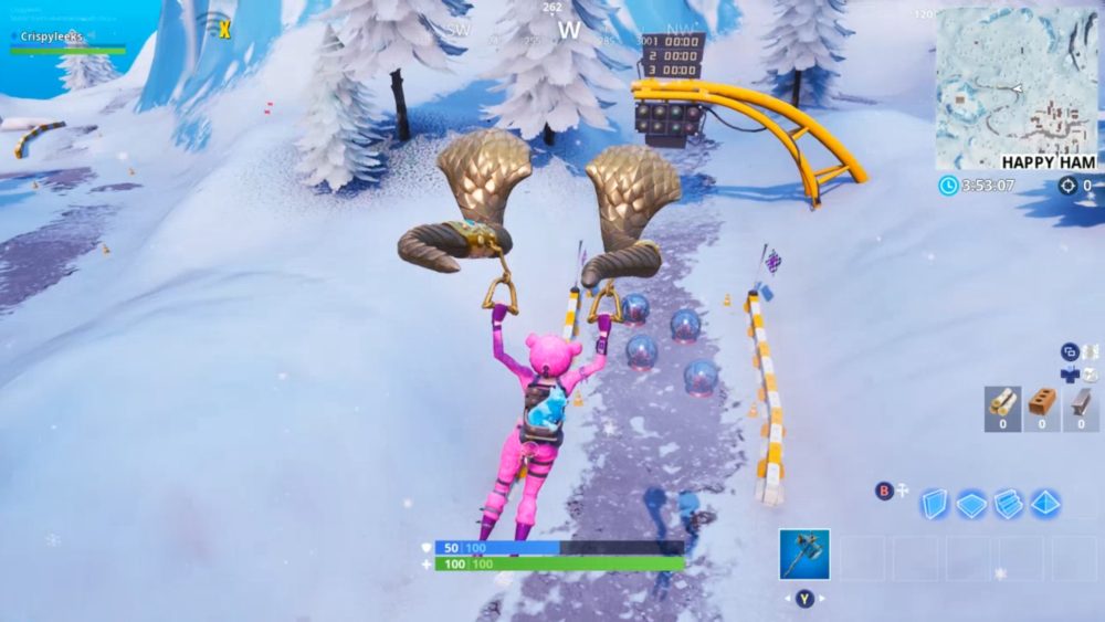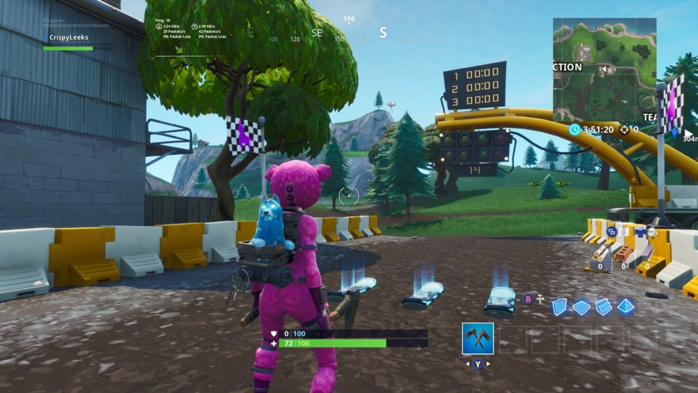 The grasslands race track in Fortnite can be found in grid coordinates C1 and C2 and is directly east from Junk Junction, just off the actual path that leads there. Follow this round and you’ll run into it. The starting line is right by the large building, and once again you’ll find hoverboards this time waiting there for you to hop onto. Do so, wait for the lights to go green, and off you go.