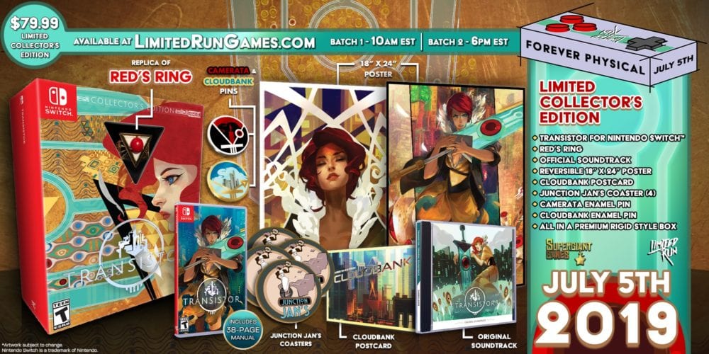 The Collector’s Editions also ship with a CD soundtrack, a reversible 18″ x 24″ poster, enamel pins featuring Transistor’s city of Cloudbank and the Camerata group, a Cloudbank postcard, coasters emblazoned with the logo of the in-game restaurant Junction Jan’s, and a replica of the protagonist Red’s ring.
