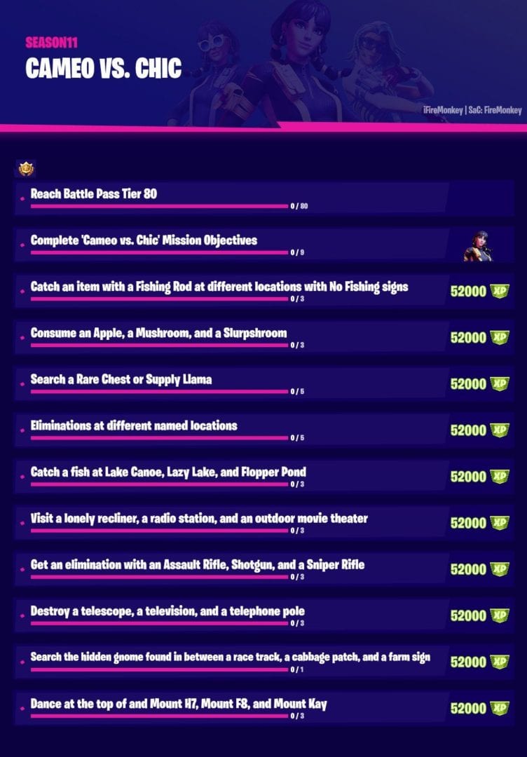 You can check out the full list of Fortnite Cameo vs Chic Overtime Mission challenges below, complete with links to our guides for individual challenges.