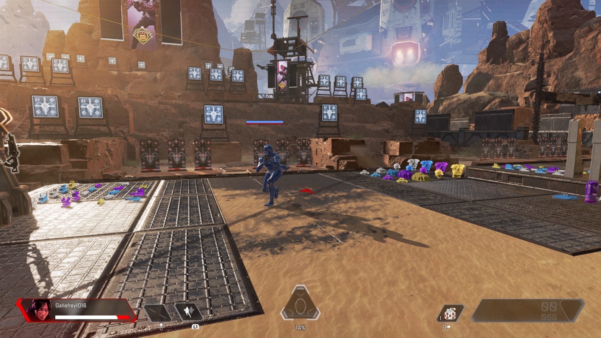 First, load up the firing range mode and choose either Pathfinder or Octane because you’ll need to get to a high point on the map with either the grappling hook or a jump pad.