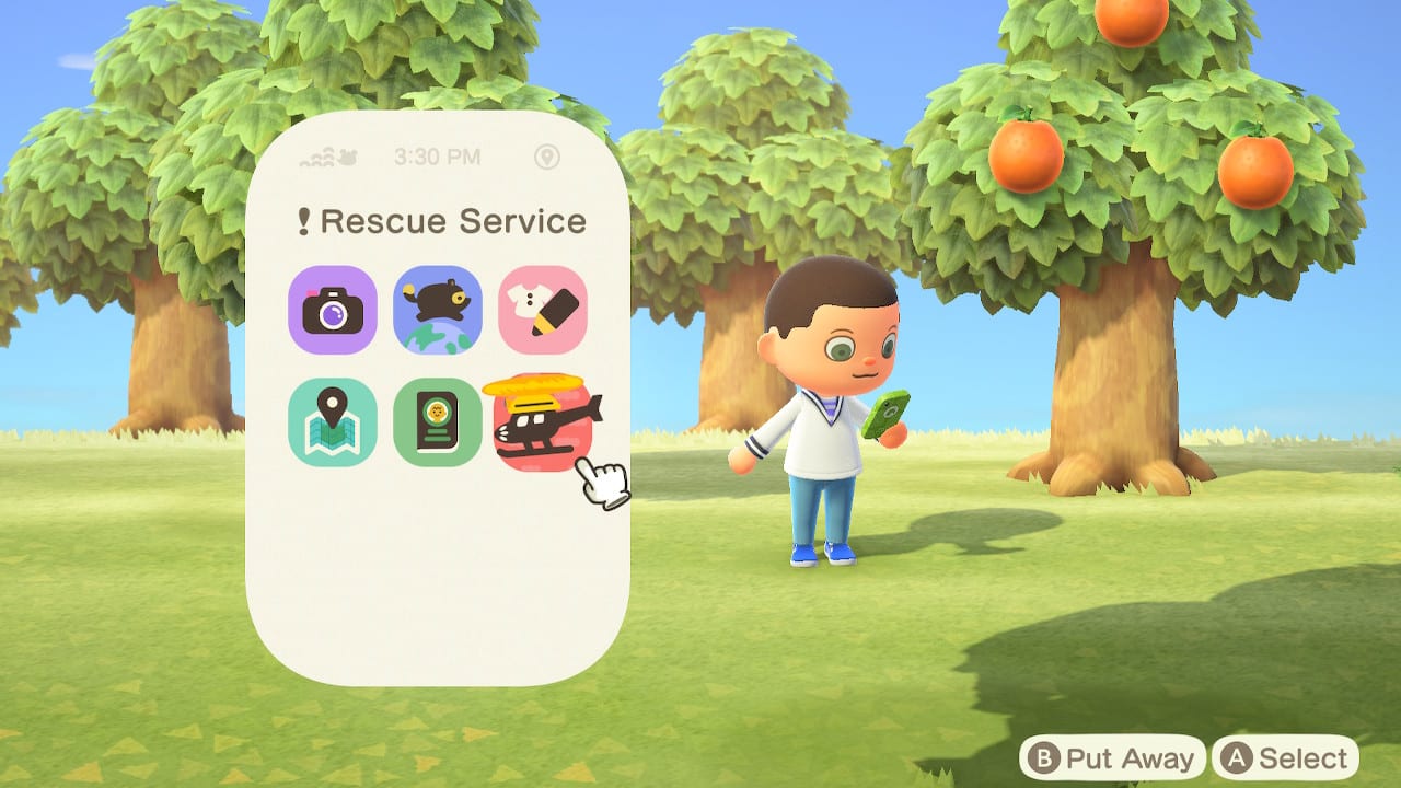 When it opens up, you simply need to highlight Rescue Service and call them. Keep in mind that using the Rescue Service does cost you Nook Miles, so make sure you’re happy to spend them before you go using the service willy nilly.