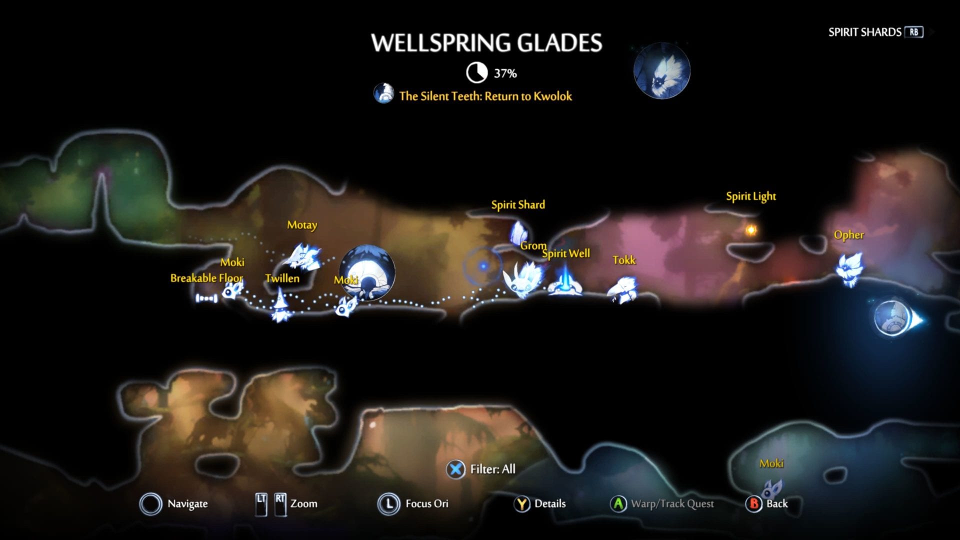 Top Tip: As soon as you get the double jump ability, make good use of it to reach the platform just above the tree that you obtained it from. You can get the ‘Sticky’ Shard this way, which makes Ori stick to walls, rather than sliding down them. It’s incredibly useful for the trickier platforming sections later.
