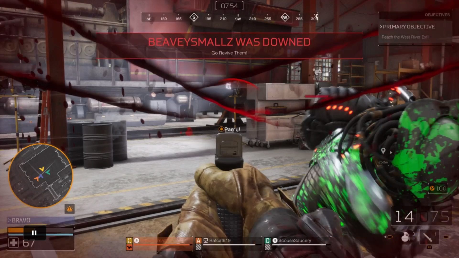 The Predator’s main weapon, which it starts with, is sharp claws that can be used to slash at targets when fighting up close. If you’re isolated as a Fireteam member, they can rip through you pretty quickly, but there’s a Parry ability that allows you to protect yourself and put the Predator on the back foot.