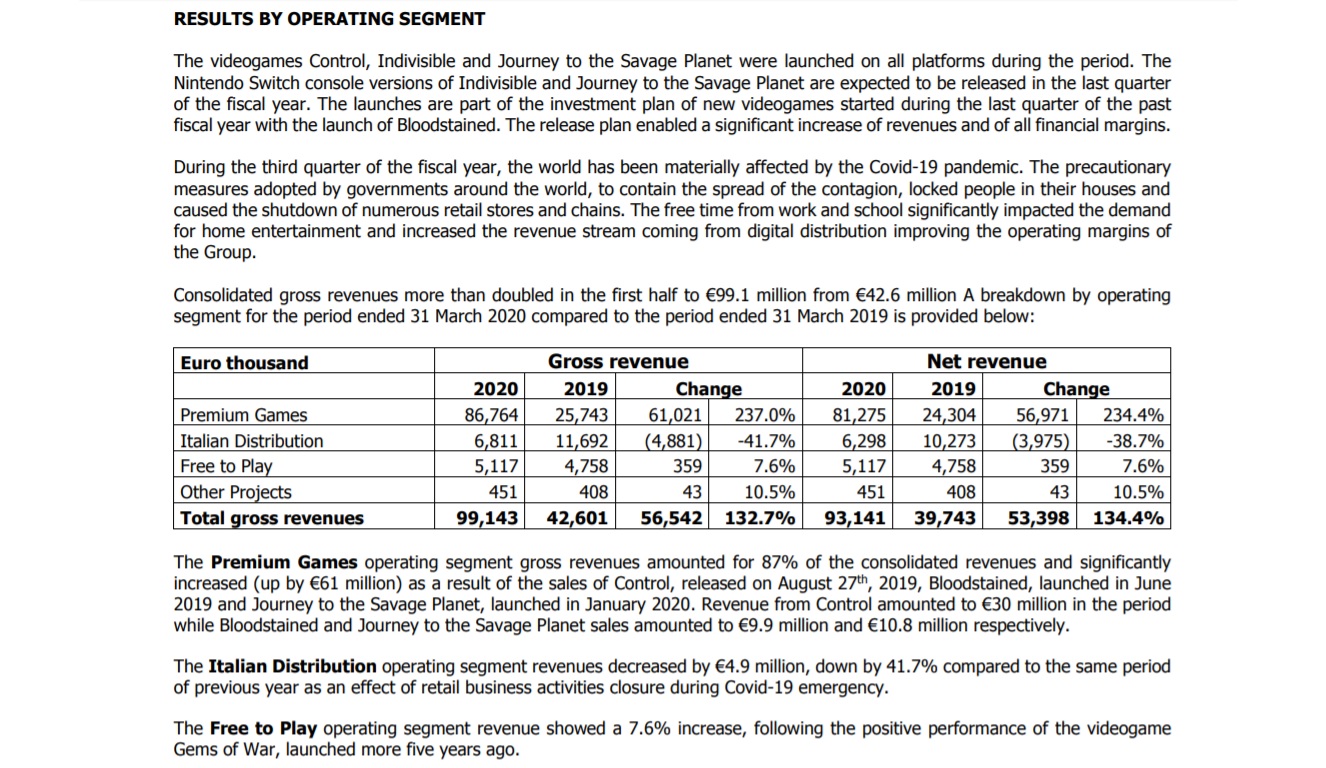 Digital Bros notes that lockdown measures as a result of COVID-19 have had a positive impact on sales, especially digital sales, as consumers look for entertainment. So drastic was the upswing in revenues that they “more than doubled in the first half to €99.1 million from €42.6 million.”