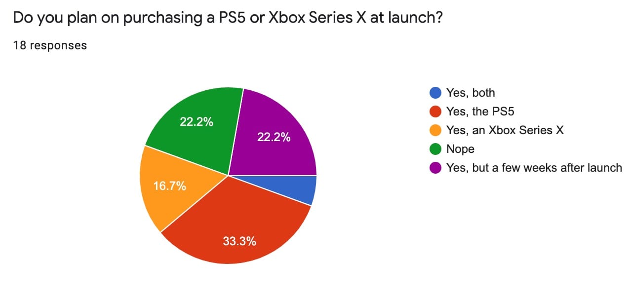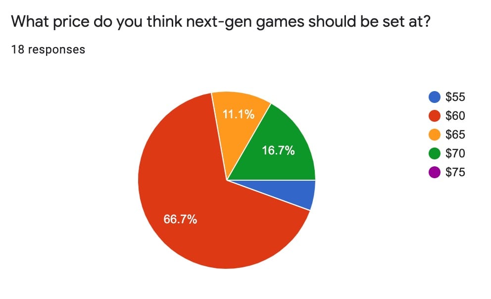 We also put up a short survey on a Google Form that asked several questions regarding the next generation of consoles and video game pricing. You can check out those results down below: