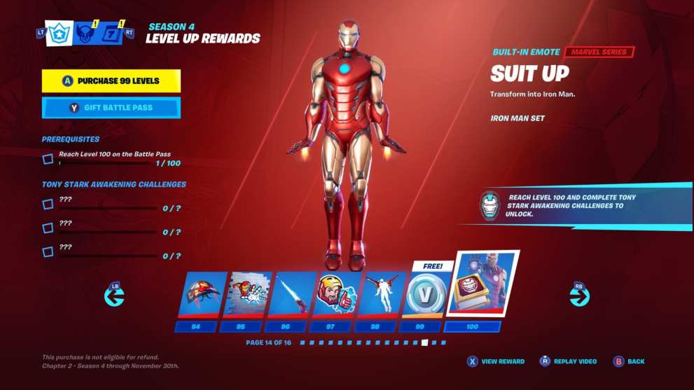 Just as was the case with last season, there are actually two (kinda) Tier 100 skins available in season 4, called Suit Up, which sees Tony Stark… suit up into his Iron Man attire. If you’re interested in grinding toward them then you’ll obviously first need to purchase the Battle Pass. It’s a simple process, but if you need help then see our dedicated guide.