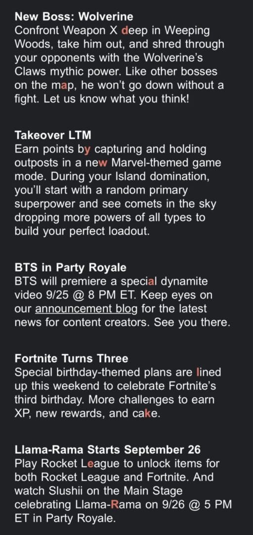 Fortnite’s v14.20 update arrives today with the downtime currently taking place. As part of this update, players can expect to see a new Wolverine boss, a Birthday event this weekend, and a new Takeover LTM to boot.