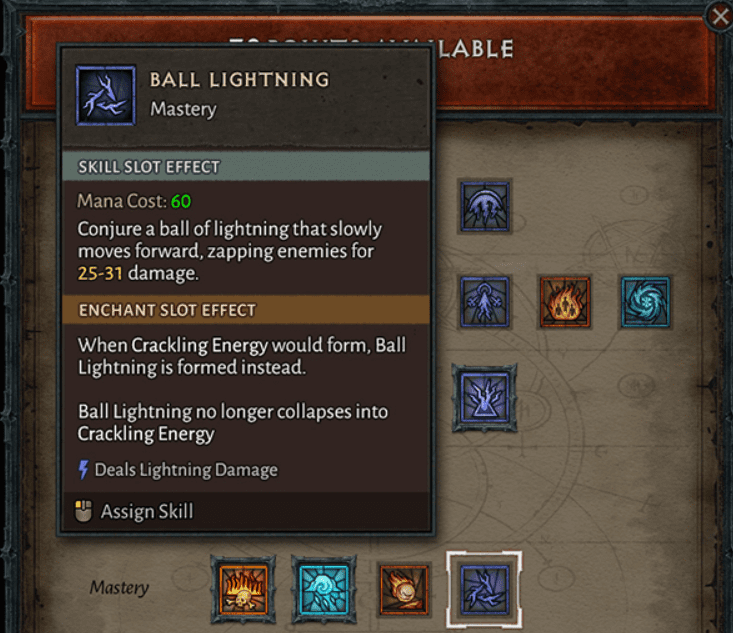 “Meteor allows you to call a fiery chunk of rock from the sky. If you choose to slot it as an Enchantment, you won’t be able to control your Meteors, but they’ll fall onto enemies periodically. This skill is still under development and may be different in the final game.“