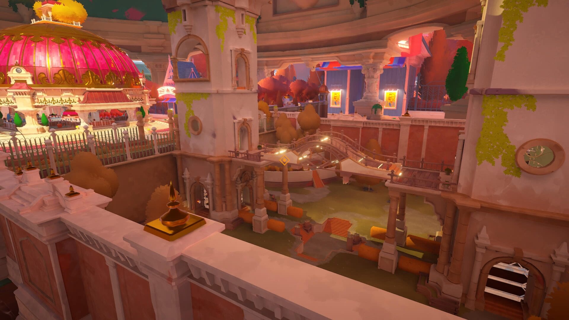 The areas you explore are vibrantly colored: the hot pink domed roof of the Maquette, for example, which is juxtaposed with the blues and whites of the sky above; pastel drawings on black screens of birds chirping in trees; the fantasy feel of the world you’re exploring. It’s the perfect setting for the fairytale romance that starts to play out.