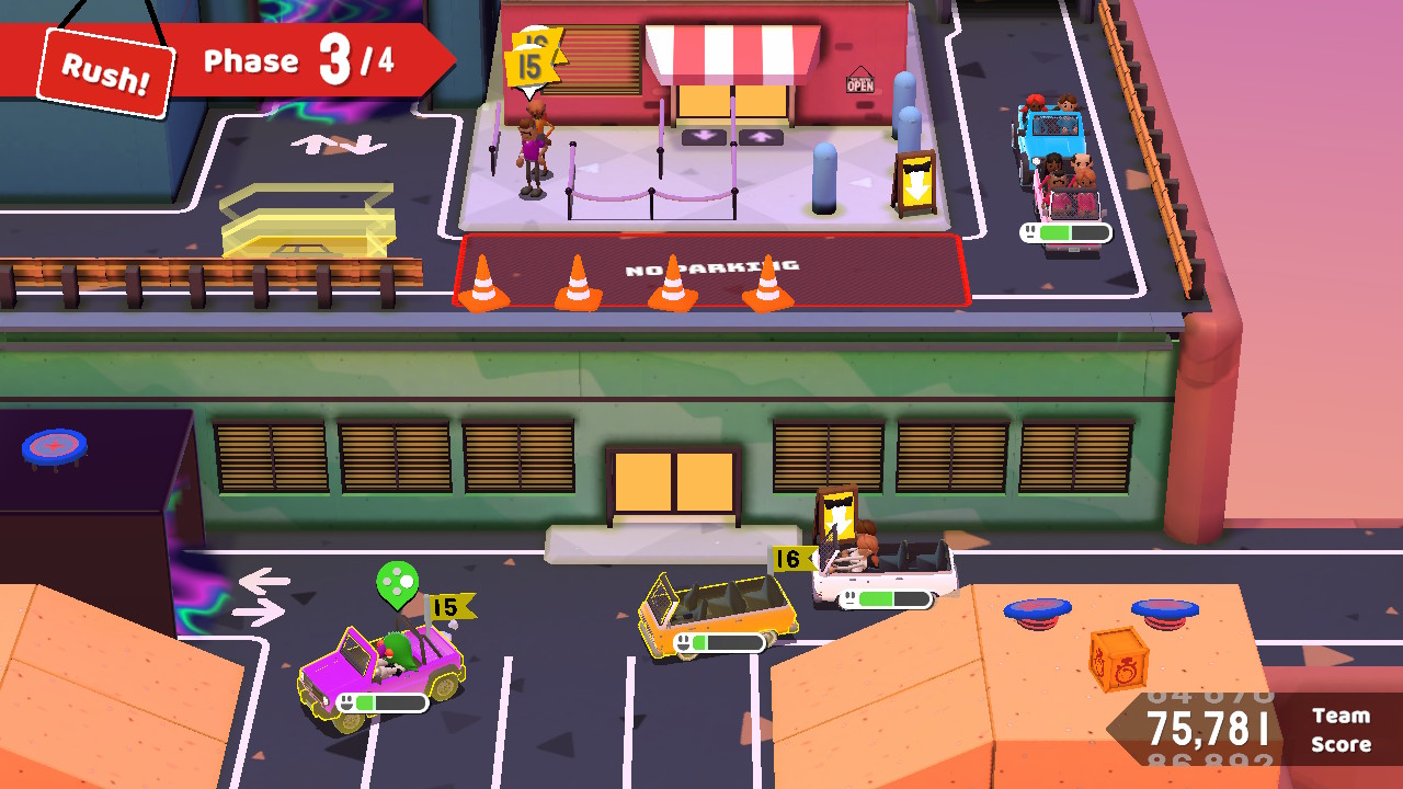 The premise here is simple, you and your friends are valets, and you must take incoming customer’s cars, park them up — if you can call it parking — and then bring them back to the pick-up point when the customers are done. There aren’t any rules here, other than you need to pick up the cars and drop them off before the customer gets too impatient and the red bar above their heads fills up and the car disappears for good.