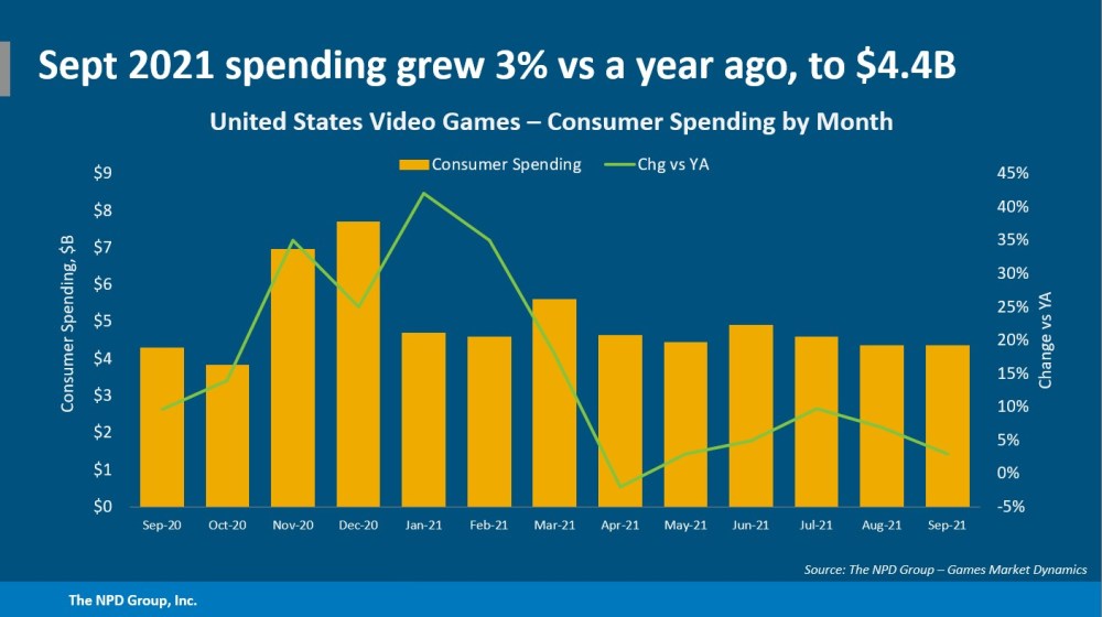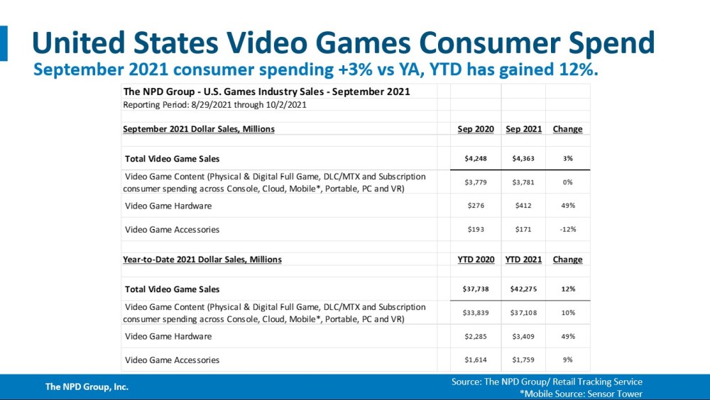 - September 2021 consumer spending across video game hardware, content and accessories grew 3% when compared to a year ago, reaching a September record $4.4 billion. YTD spending reached $42.3B, a 12% increase versus a year ago.