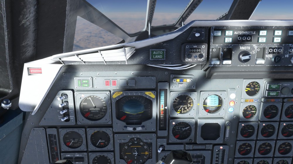 One interesting fact about Concorde was how the fuselage stretched almost two feet when at Mach 2, due to the heat from friction caused by slicing through the atmosphere faster than a rifle bullet. Famously, on her last flight, the captain of one Concorde took off his cap at Mach 2 and pushed it into a gap that always formed in the cockpit during supersonic flight, which closed up again when they slowed down to land, forever trapping his cap in place. Concorde fans will be delighted to know that this “stretching” has now been replicated in the DC Designs Concorde. The supersonic stretch can be seen in the increasing size of that same gap where the captain left his cap, between the engineer’s panels and the rear wall of the cockpit. Images of the “stretch” can be seen in this week’s screenshots. It’s another one of those unique Concorde features that I’ve been very keen to add. The reason I’ve been able to take a screenshot of the feature is that in the fastest test flight yet, Concorde reached Mach 1.78 at 44,000ft less than an hour after taking off with a full fuel load. At that point in the flight, she was still too heavy with fuel to go any higher or faster, a genuine feature of the real Concorde. Concorde will now reach Mach 2 as more fuel is burned off.