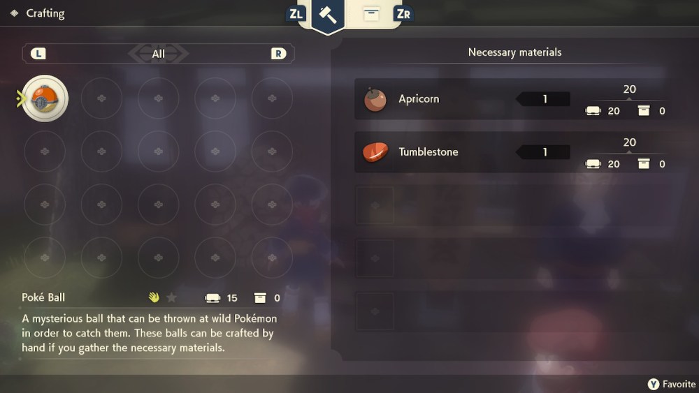 Crafting tables are located at every base camp in the open-world, and there’s also one you can use back in Jubilife Village. Interact with it by pressing the A button, and you’ll bring up the crafting menu which lists every recipe you’ve learned so far.