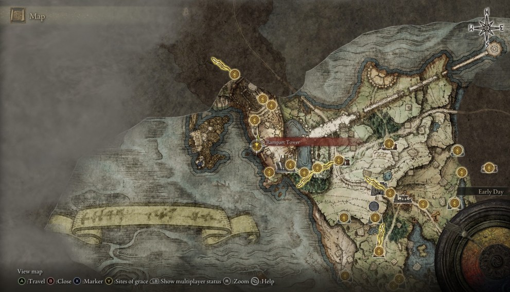 - Progress through the level until you reach the Site of Grace in the Rampart Tower.