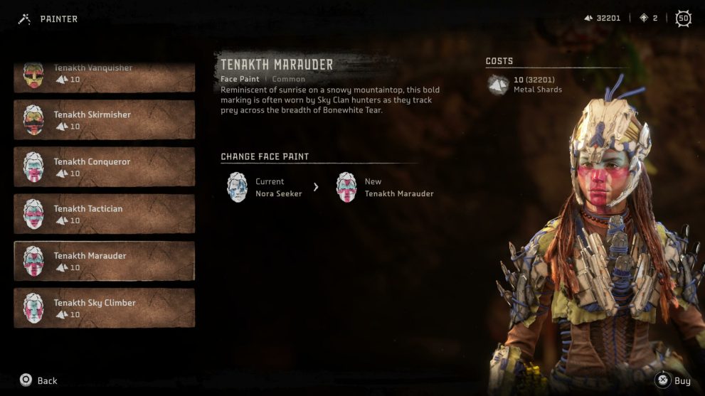 - Choose your favorite face paint, and apply it for 10 Metal Shards. Removal costs 1 Metal Shard.