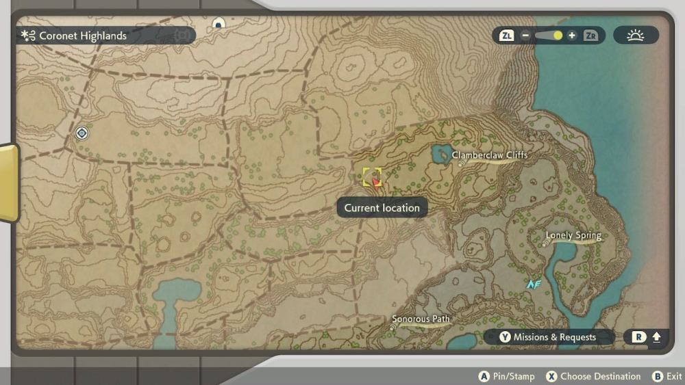 The easiest way to climb the cliffs is to continue through the Legends Arceus main story in the Coronet Highlands until you get the Sneasler ride Pokemon that allows you to scale sheer rock faces. Once Sneasler is available, simply press A next to a rock face to call it and climb straight up. Use this ability to get to the spot on the map shown above.
