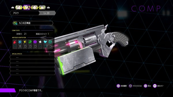 Arrow’s COMP is a gun-type so his basic attacks are bullets. He is strong with the ice elements and support skills. His physical strength is considerable and depending on how he’s specced he can learn skills to shield his allies.
