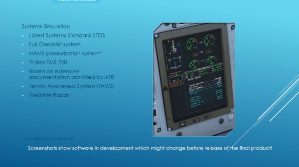 The systems are modeled up to the latest ATR standard (STD3), with a full checklist system, NAMS pressurization system, the Thales FMS 220 with 2 MCDUs, TAWS, and Weather Radar.