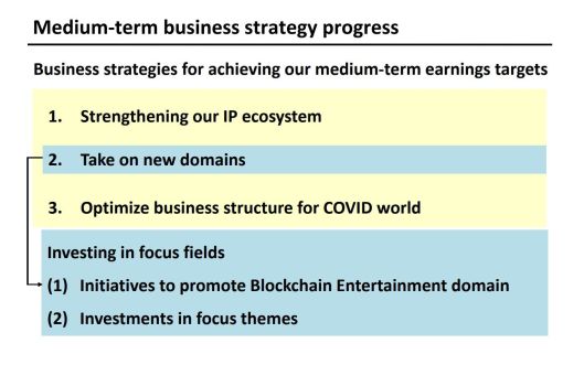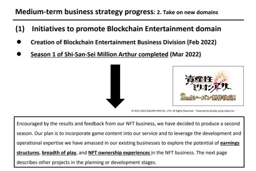 The company has created a Blockchain Entertainment Business Division in February, and “encouraged by the results and feedback from the NFT business” with the first season of the NFT game Shi‐San‐Sei Million Arthur, they are producing a second season.