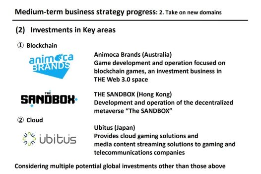 The last slides mention investments made in Blockchain with Animoca Brands and The Sandbox, and in cloud gaming with Ubitus. “multiple potential global investment” in addition to those are being considered.