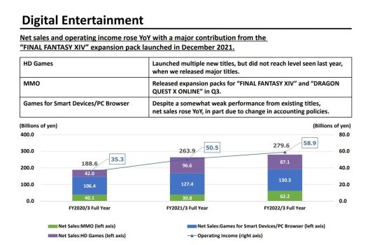 Looking at the Digital Entertainment segment, which includes games, revenue for HD games dropped slightly year-on-year despite launching multiple new titles. On the other hand, the performance of the MMO business grew sharply thanks to the launch of expansions for Final Fantasy XIV and Dragon Quest X, on top of a “sharp rise in monthly subscribers” for FFXIV.