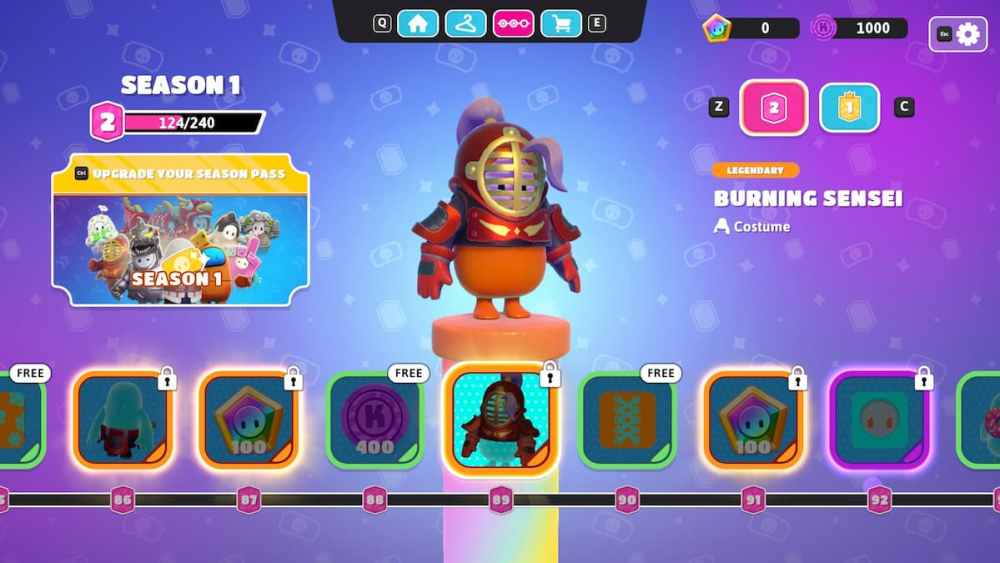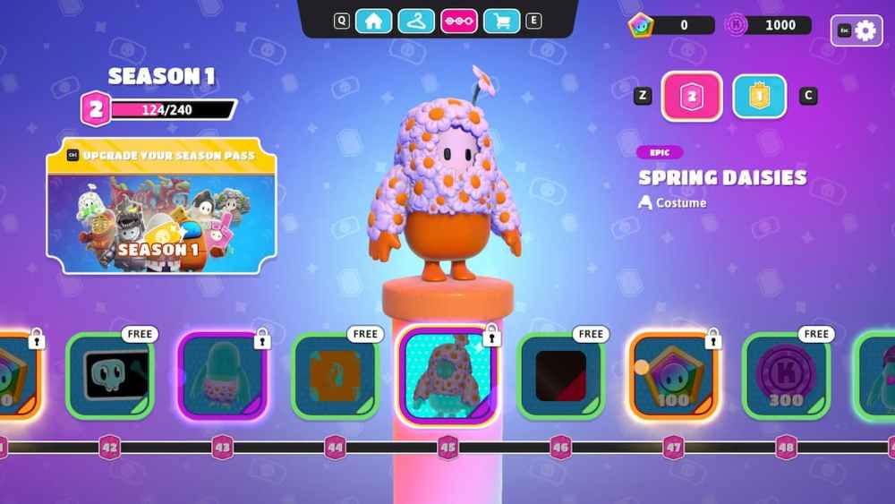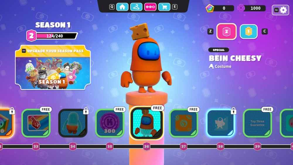 Editor’s Tip: We’d recommend you get the Season 1 Starter Pack in Fall Guys from the Item Shop. This costs a tiny bit more than 1,000 Show-Bucks would on its own, but also gets you a couple of Sushi Costumes to mix up your look. Use the 1,000 Show-Bucks that come in the Starter Pack to buy the Season Pass and you’ve got yourself some extra cosmetics for a couple bucks!