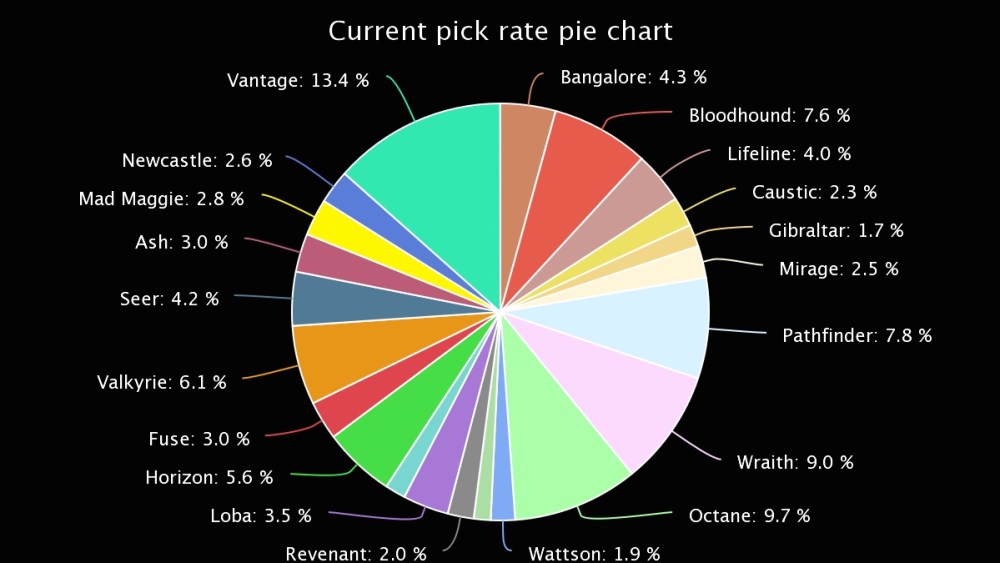 There’s also been a big fall in popularity for Mirage and Ash, while Rampart, Gibraltar and Newcastle remain amongst the most unpopular characters, with players clearly struggling for reasons to pick them in their matches.