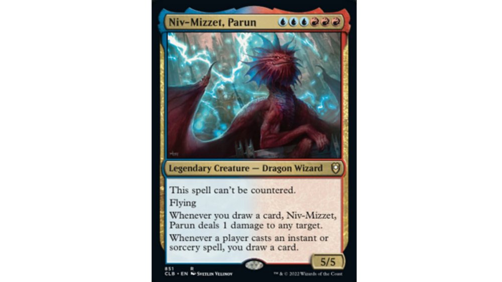 Niv-Mizzet is a fan favorite for being a blue and red Izzet dragon. This lets you focus your deck build on blue’s best instants that include counter magic, draw spells, and other powerful effects. Red gives you direct damage, spell copying, and a chaotic mix of fast mana and card draw.
