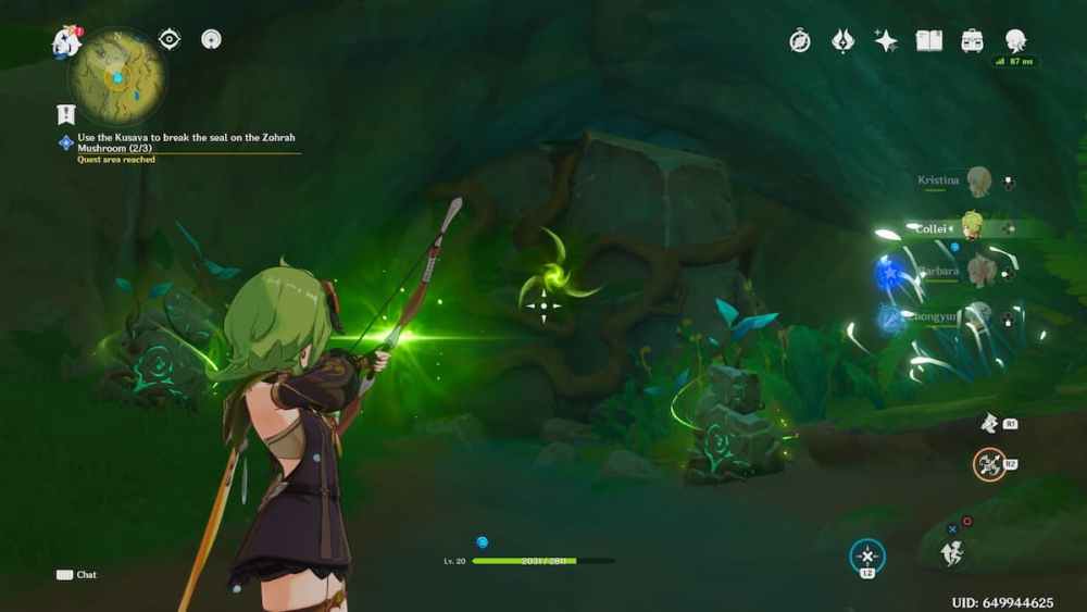 Use the Kusava on the two seals at the end of the cave. Then, summon the Dendrograna and utilize your Dendro character to break the barrier where the third and final seal is located.