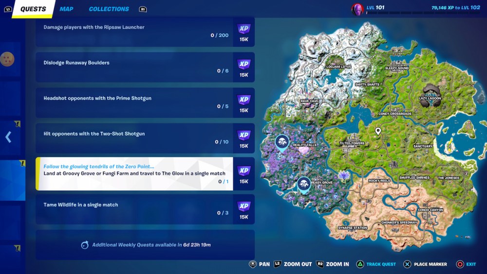 While Fortnite often gives plenty of information when starting the weekly quests as far as completing them goes, sometimes they are left up to the player to figure out. For this quest, players are given the choice of landing location, but their destination isn’t marked on the map, and they must know for themselves where to go. Fortunately, we have all the necessary information. Here’s how to land at Groovy Grove or Fungi Farm and travel to the Glow in Fortnite Chapter 3 Season 3.