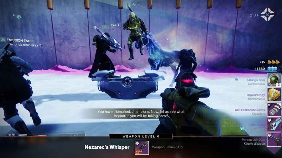 The very first thing you should do before doing any runs of Dares of Eternity is stop by Xur’s Treasure Hoard and load up on bounties. While Xur’s bounties do not provide any extra loot or reputation with him, they do provide XP which is important to acquire in order to progress this season’s Battle Pass. Might as well get them done at the same time as your runs!