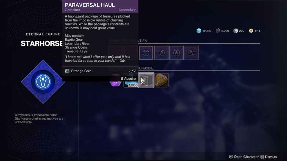 Paraversal Hauls are lootboxes you can buy from the Starhorse, which reward exotic and legendary gear, strange coins, and most importantly Treasure Keys. These keys are what give you the best chance to get the Red Border weapons you will need, so it is important to get as many as possible.