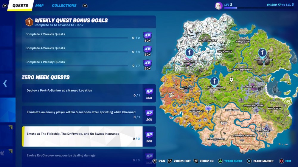 The full challenge tasks players to “Emote at The Flairship, The Driftwood, and No Sweat Insurance,” so we are going to show you all these landmarks.