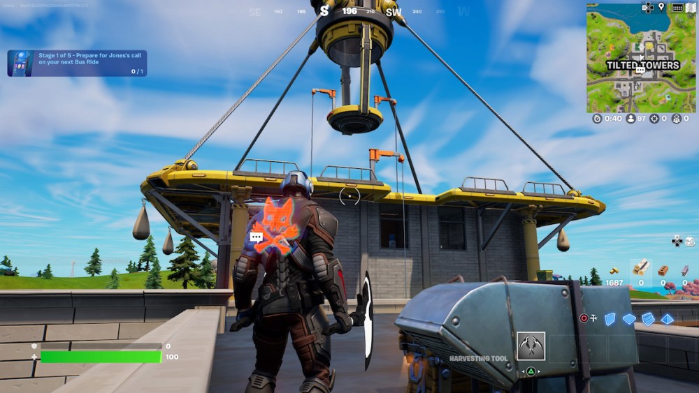 The sponsor from the big No Sweat Summer event a few months back has returned in force to the island. No Sweat Insurance can be found floating about Tilted Towers. Considering how popular Tilted Towers has always been, your best bet is to land here instead of trying to get up here later using the ascenders.