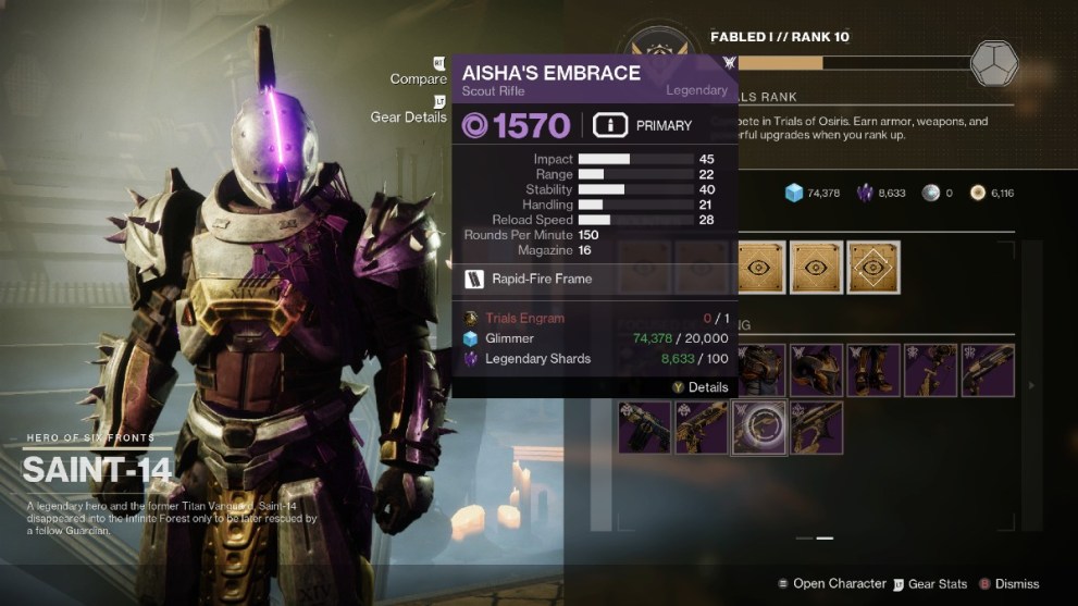 Iron Banner has come and gone in Destiny 2. But soon after, Trials of Osiris quickly returned in its place. With the return of Trials of Osiris comes the exclusive armor and weapons for it as well. One of which is a returning top-tier Scout Rifle, Aisha’s Embrace. So today, let’s discuss how to get the Aisha’s Embrace Scout Rifle, as well as what the God Roll for it is.