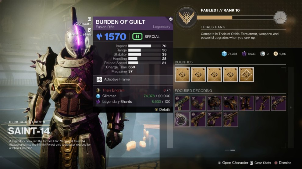 Once you finally acquire one copy of Burden of Guilt, head back to Saint-14. Using another Trials Engram, you can then buy multiple copies of Burden of Guilt until you reach the roll you’re looking for. However, purchasing direct copies of the gun can get pretty expensive, so make sure you keep track of how many you’re buying.