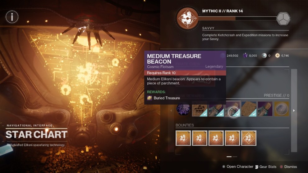 To gain access to the second Cryptic Quatrain quest, you’ll have to reach rank ten with the star map in the H.E.L.M. You can do so by completing bounties and the Ketchcrash or Expedition activities. Once you rank up, you can grab the Medium Treasure Beacon, which will begin the second Cryptic Quatrain.