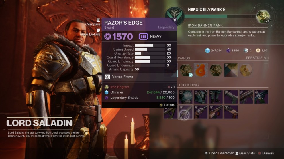 In order to buy your own copy of Razor’s Edge, you must use one of the Iron Engrams you have earned and then buy one directly from Lord Saladin himself. It will cost you 100 legendary shards and 20,000 glimmer per purchase, so make sure you spend wisely. This applies to all other Iron Banner gear as well.