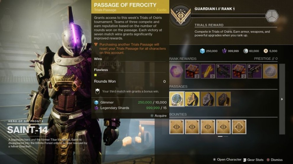 Before jumping into the action, head over to Saint-14 in the Tower Hangar and buy a passage from him. You cannot participate in the Trials of Osiris until you acquire a passage.