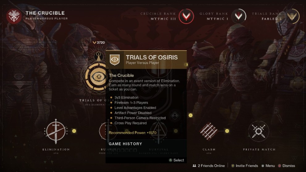 Trials of Osiris is a weekend exclusive game mode, starting every Friday at the daily reset until the daily reset on the following Tuesday. Go to the crucible tab on your destination screen and select the featured Trials of Osiris game mode for that week.
