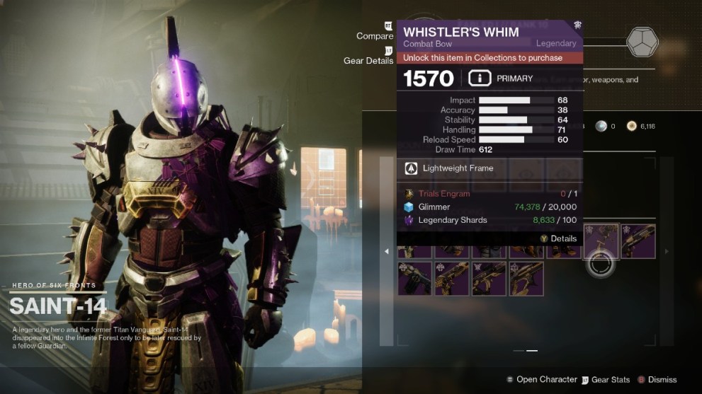 After ranking up a few times, head back to Saint-14 in the Tower Hanger. He’ll be waiting for you with Trials Engrams as a reward for ranking up. You can either decode your Engram at Master Rahool, or focus it at Saint-14 to buy a copy of Whistler’s Whim. However, before you do so, you must have gotten at least copy of it prior to buying one. If you have yet to obtain one, head over to Master Rahool and decode your Engrams until you get one.
